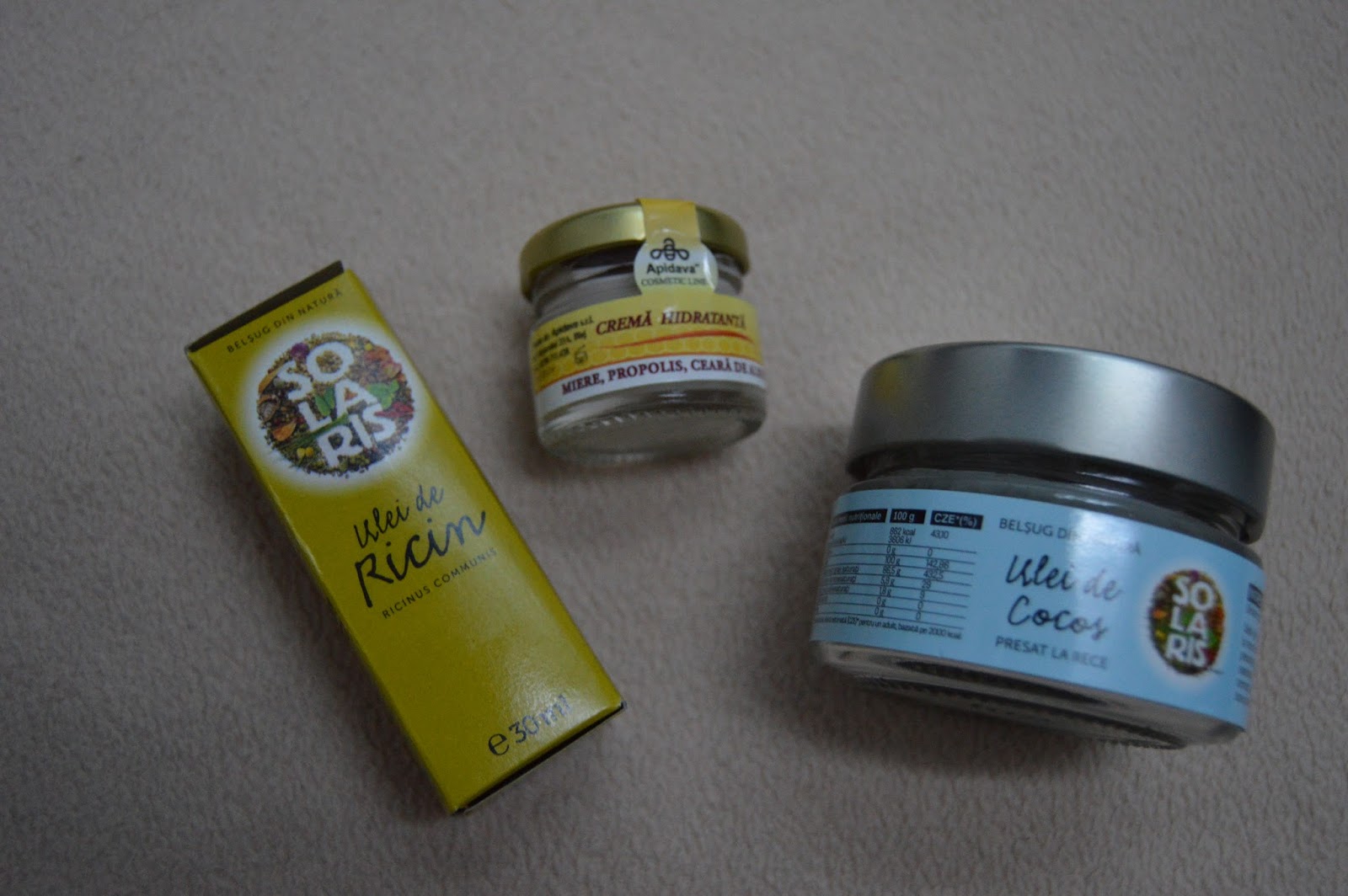 Comanda de pe vegis a fost destul de mare, asa ca am decis sa va arat doar aceste 3 produse care sunt minunate si sunt sigura ca le folositit si voi, cel putin 2 dintre ele. Uleiul de cocos, de la Solaris pe care il recumpar mereu deoarece face minuni, uleiul de Ricin potrivit atat pentru par cat si pentru sprancene si o crema hidratanta cu miere, propolis si ceara de albine foarte buna pentru tenul uscat si deshidratat din cauza vremii.
