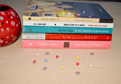 Am sa incep cu cartile, pe care le-am achizitionat de pe elefant:Diana cu Vanilie (Diana Sorescu), am citit aceasta carte online undeva prin noiembrie anul trecut, e absolut fabuloasa, scrisa ca un jurnal, autoarea si-a descris parerea despre anumite teme cum ar fi femeia si barbatul. Pe langa asta, are un stil comic de a isi asterne ideile si parerile. V-o recomand cu drag. Barbatii sunt de pe marte, femeile sunt de pe venus (DR. John Gray) este manualul relatiilor de dragoste din ziua de astazi, femeia si barbatul avand o viziune diferita asupra vietii. Am inteles ca e un bestseller, am sa scriu o postare despre ea dupa ce o citesc. M-am hotarat sa devin prost (Martin Page), ce m-a atras la cartea aceasta a fost titlul, sunt foarte curioasa cum sunt punctate ideile autorului, am inteles ca subiectul principal ar fi eterna intrebare “Oare prea multa minte strica?”.La fel, am sa revin cu o postare despre aceasta carte dupa ce o citesc. Uneori castigi, uneori inveti (John C. Maxwell), am auzit ca e o carte buna dupa care ne putem ghida in viata, mai ales ca cele mai importante lectii de viata sunt deprinse din esecuri. I’ll give it a try si am sa revin cu un review curand. Roz Tranchilizant (Adam Alter), am inteles ca e o carte despre cum functioneaza lumea si cum functionam noi in ea si ca controlul mintii e un joc complicat pe care il poti deprinde doar dupa ce inveti regulile jocului. Interesant, este? Va spun dupa ce o citesc. Ultima carte achizitionata Mituri si Legende din intreaga lume, fiind o carte de la Reader’s Digest publicata in 2010 am gasit-o foarte greu. E foarte interesanta si captivanta, despre mituri si legende din intreaga lume dupa cum ii spune si numele.