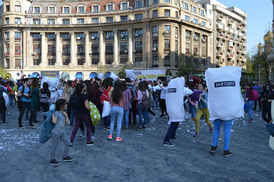 Am iesit pe la ora 16:00 deoarece am vazut o postare pe internet cum ca in Piata Universitatii e un eveniment cu batai cu perne. Ideea mi s-a parut geniala, cel putin ca spectator. Am ajuns acolo, erau o multime de oameni care se bateau cu perne, radeau si se simteau bine. Am facut niste poze, niste filmulete, iar dupa ce ne-am umplut de puf am hotarat sa mergem sa ne plimbam.