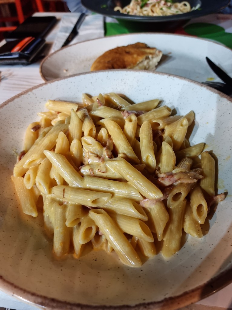 Am optat si pentru variante safe, pe care le cunosteam, cum ar fi pastele: paste cu pui si sos alb si paste cu creveti. Restaurantul Pizzarella, din centrul orasului Naoussa, e un must. Au cea mai buna pizza facuta pe vatra, foarte rapid preparata si cele mai bune si proaspete paste. La fiecare masa, primiti din partea ospatarilor desert gratis. Noi am baut pentru prima data limoncello si am mancat un mousse foarte delicios.
