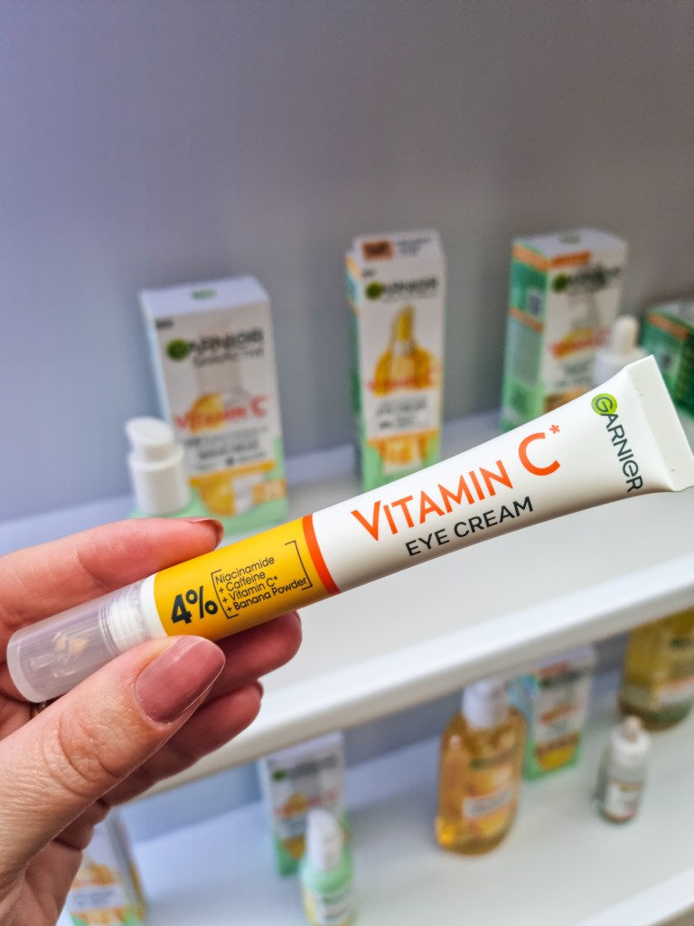 Garnier Skin Naturals Vitamin C, crema iluminatoare pentru ochi, imbogatita cu 4% niacinamida + cafeina +vitamina C + pudra de banane, ce reduce semnele de oboseala, cearcanele si liniile fine pentru un aspect mai luminos. Nu contine parfum, se poate aplica zilnic sub ochi si pe pleoape si ajuta si masarea zonei cu miscari usoare de tapotare.